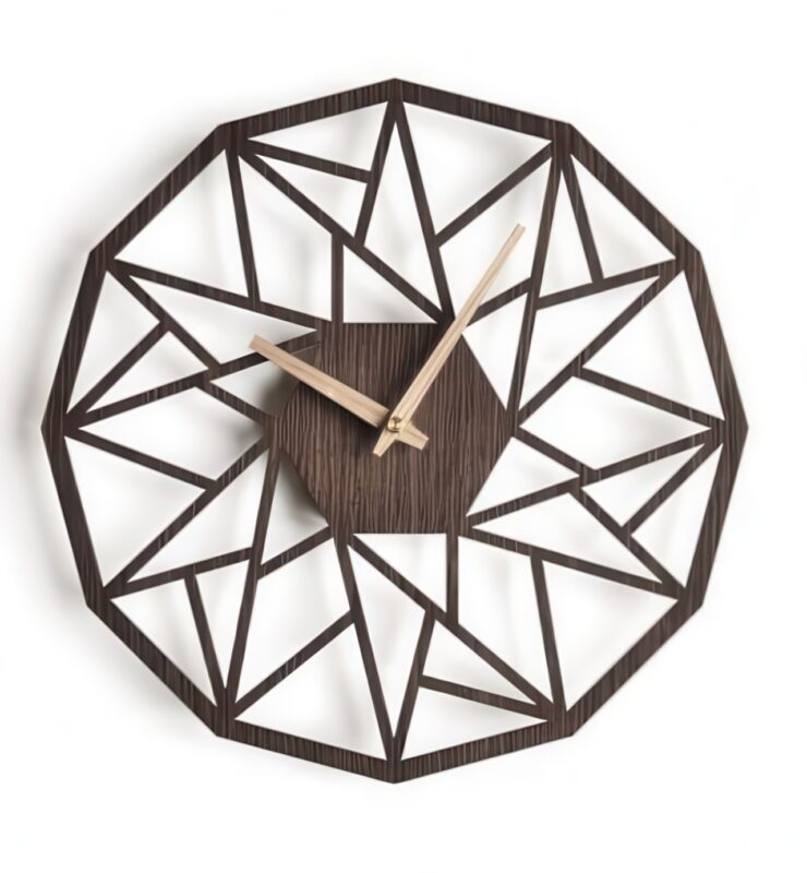 این ساعت دارای قاب چوبی با طراحی هندسی و مینیمال است که جلوهای مدرن و شیک به فضا میبخشد. برشهای دقیق لیزری و طراحی مشبک، باعث شده تا این ساعت در هر محیطی بهعنوان یک دکوری خاص خودنمایی کند. عقربههای طلایی یا روشن، جلوهای لوکس به طراحی کلی آن افزوده است. ⌛