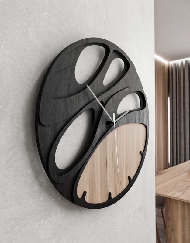 این ساعت به شکل دایره طراحی شده و ترکیب چوب طبیعی و امدیاف مشکی با برشهای منحنی و هنری باعث شده جلوهای مدرن و منحصربهفرد داشته باشه. عقربههای مینیمال نقرهای و ظریف، زیبایی اون رو تکمیل کردهاند.