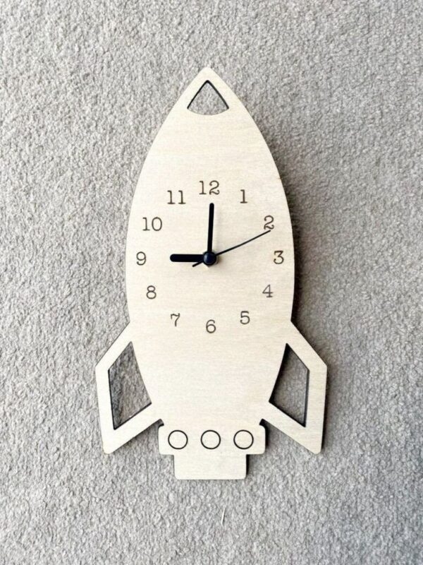 ساعت به شکل یک راکت طراحی شده و اعداد به صورت دایرهای روی بدنه آن حک شدهاند. قسمت پایین بدنه شامل سه دایره بهعنوان خروجی موشک است و بالههای کناری با برش باز طراحی شدهاند تا زیبایی و ظرافت بیشتری به آن بدهند.