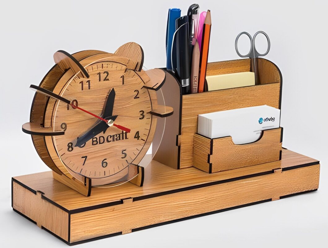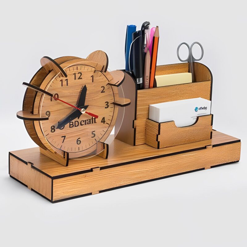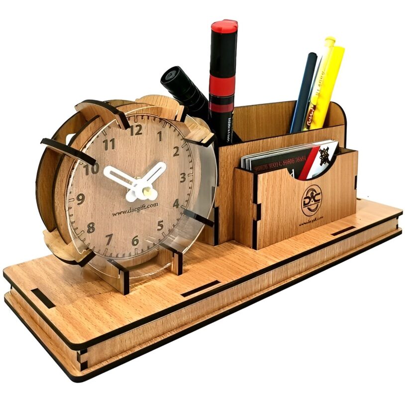 این ساعت رومیزی چوبی دارای یک محفظه مخصوص برای نگهداری از مداد و خودکار است و همچنین دارای یک محفظه جداگانه برای نگهداری از برگه های یادداشت و یک جای دیگر برای نگهداری از کارت ویزیت ها است. در کل با استفاده از این ساعت رومیزی چوبی شما صاحب بک جاکارتی، جامدادی و جای برگه خاص و زیبا خواهید شد.