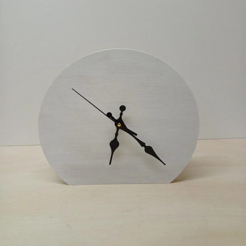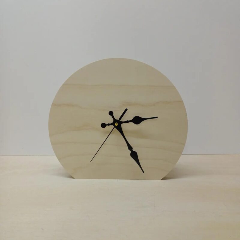 صفحه دایرهای برشخورده از چوب سهلایه، با ضخامت ۳ میلیمتر. قابل سفارش در دو رنگ: سفید و طرح چوب طبیعی. عقربههای مشکی کلاسیک. ایستاده روی سطح صاف بدون نیاز به پایه جداگانه.