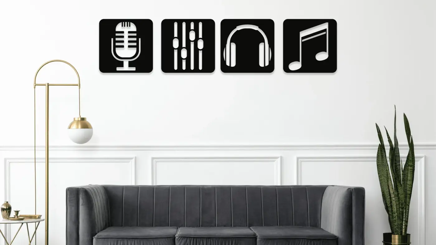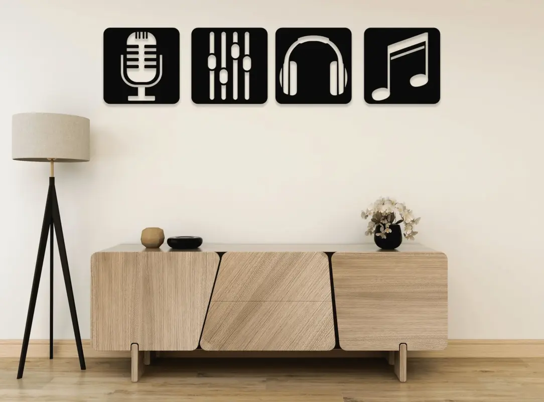 ست تابلو دیواری طرح موسیقی، یک انتخاب فوقالعاده برای علاقهمندان به موزیک، استودیوهای ضبط، اتاق کار هنرمندان یا حتی اتاق نشیمن و اتاق خواب با دکور مدرن و خاص است! این مجموعه شامل چهار تابلوی مربع شکل از چوب سه لایه با کیفیت است که هرکدام نمادی از دنیای موسیقی مثل میکروفن، هدفون، نت موسیقی و تنظیمکننده صدا را به نمایش میگذارند. این طرحها با برش دقیق لیزری و رنگ مشکی خاص، جلوهای مینیمال، حرفهای و کاملاً مدرن به فضای شما میدهند. 🎵🎧🎤