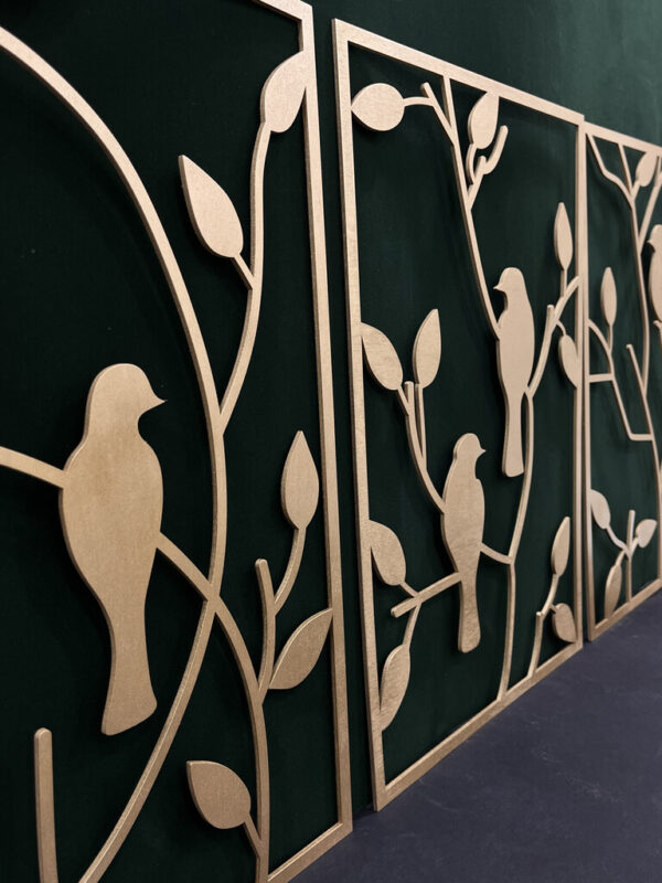 ست تابلو دیواری پرندگان از چوب سه لایه با ضخامت 3 میلیمتر ساخته شده است. هر تابلو دارای قاب مستطیلی است که درون آن طرحی از پرندگان نشسته بر شاخهها به شکلی هنری و مینیمال قرار گرفته است. این طراحی خاص باعث میشود که این مجموعه به راحتی در فضاهای مختلف بدرخشد.