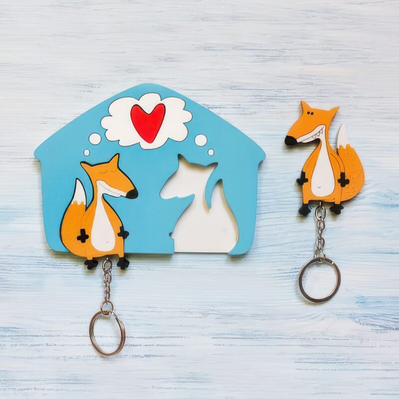 یک صفحه آبیرنگ به شکل خانه، با دو فضای توخالی به فرم روباه برای جایگیری جاکلیدیها و طراحی برجسته و رنگی روباه نر و روباه ماده بهصورت جاکلیدی جداشونده. بالای آن ابر فکری و قلب قرمز قرار دارد که جذابیت بصری آن را دوچندان کرده است.