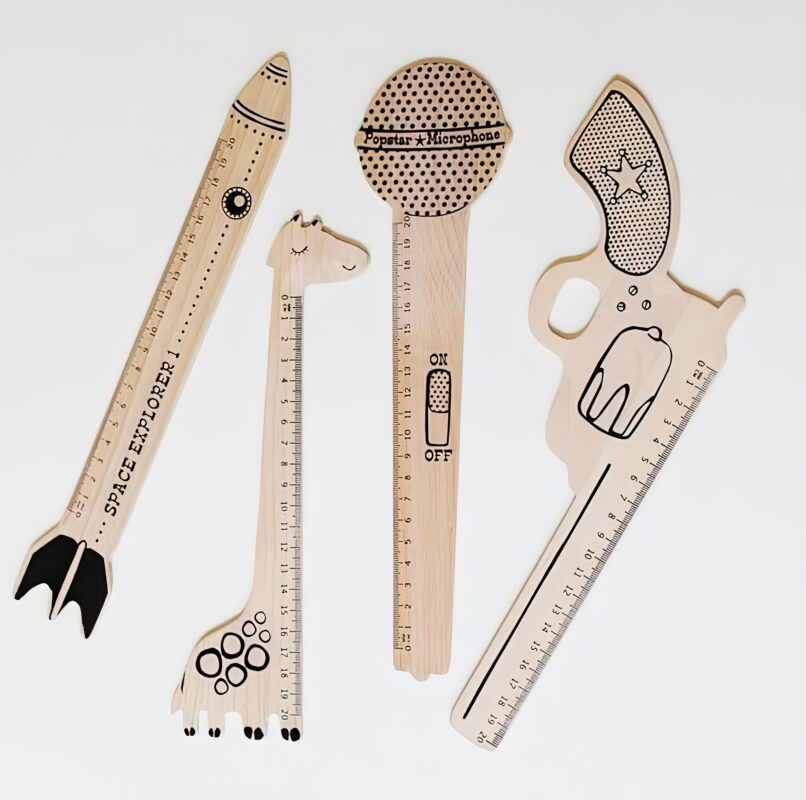 ست شامل چهار عدد خطکش با طراحیهای فانتزی (موشک، زرافه، میکروفون، هفتتیر) از چوب سه لایه است. طرحها با برش لیزری و چاپ مشکی اجرا شده و ابعاد هر خطکش مناسب دست کودک است.