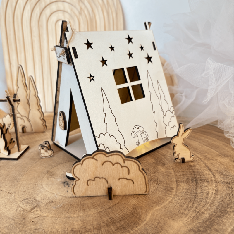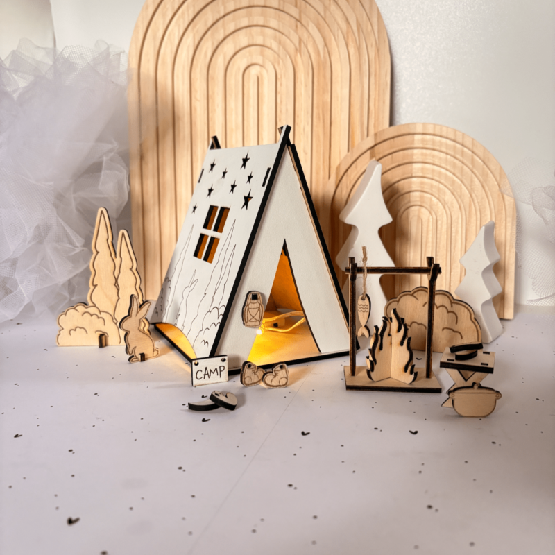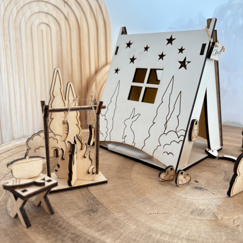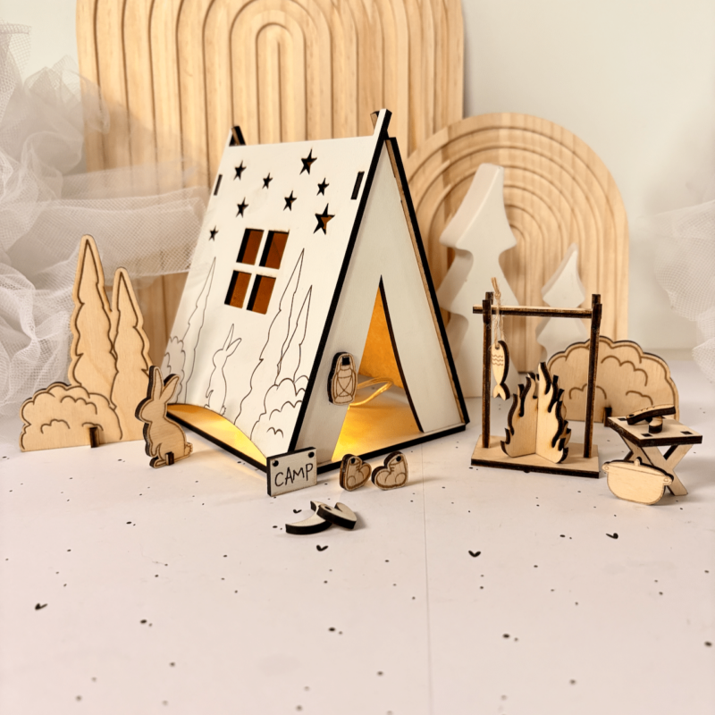 تمام اجزای این ست از چوب طبیعی سهلایه ۳ میلیمتری ساخته شده و با برش لیزری دقیق شکل گرفتن. چادر کمپ با رنگ سفید و طرح ستارهها تزئین شده و داخلش نور ملایمی قرار گرفته که فضا رو گرم و جادویی میکنه ✨ اطراف چادر هم عناصری مثل درخت، خرگوش، تابلوی کمپ، نیمکت، قابلمه، و حتی ماهی آویزون روی آتش دیده میشن! هر جزئیاتی با عشق طراحی و اجرا شده تا حس واقعی زندگی در دل طبیعت رو منتقل کنه.