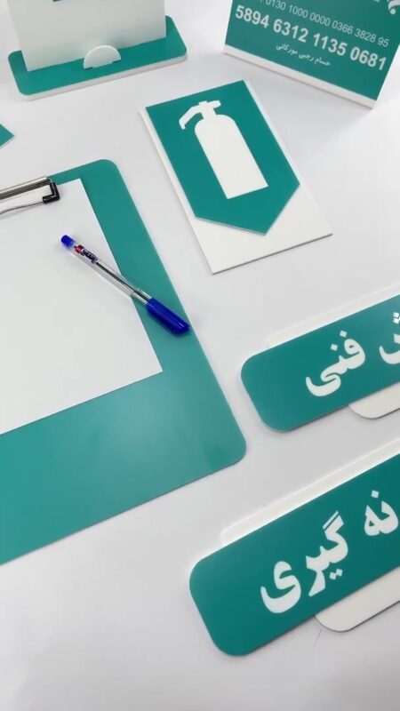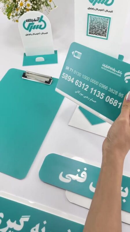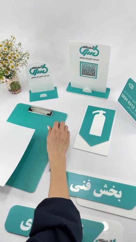 در این پکیج کاربردی، همه چیز برای یک معرفی کامل و دقیق فراهمه؛ از تخته شاسی برای کارهای روزمره گرفته تا پلاکهای واحد جهت مشخصکردن بخشهای مختلف و حتی استند QR برای معرفی شبکههای اجتماعی یا نوبتدهی آنلاین. همه آیتمها با چاپ فلتبد رنگی و با دوام تولید شدهن و رنگ خاص فیروزهای اون حس تمیزی، سلامت و حرفهای بودن رو القا میکنه. 🌟