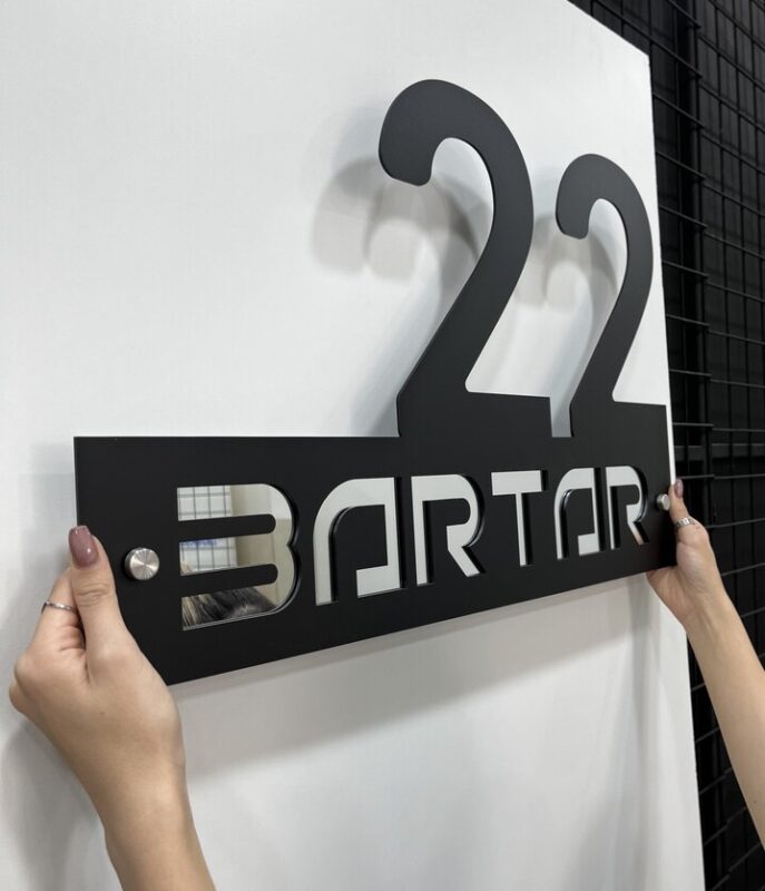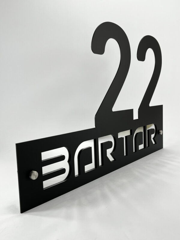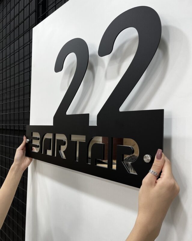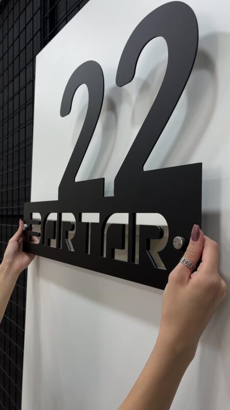ترکیب حرفهای عدد بزرگ “22” در بالای پلاک و نام “BARTAR” به سبک خاص و متفاوت باعث شده تا این تابلو نه تنها شمارهپلاک بلکه نشانی از سلیقه و سبک زندگی لوکس شما باشد. همچنین استفاده از اسپیسرهای فلزی باعث شده تابلو بهصورت برجسته و شکیل روی دیوار نصب شود و جلوهای سهبعدی پیدا کند✨