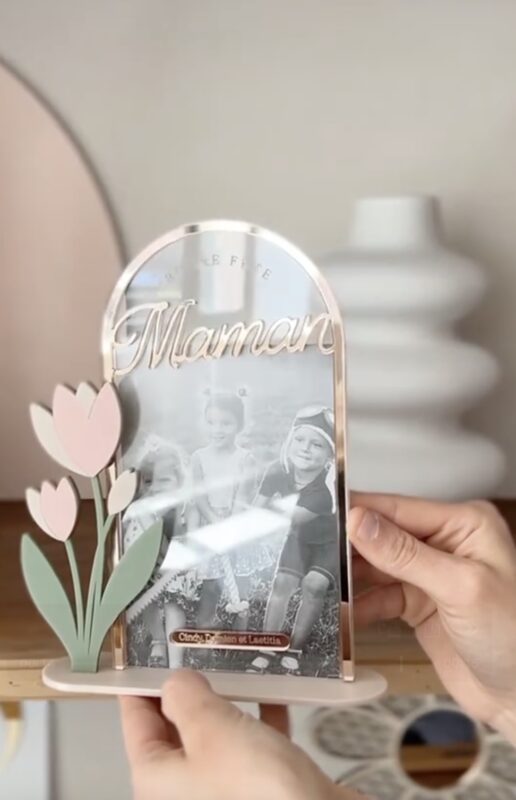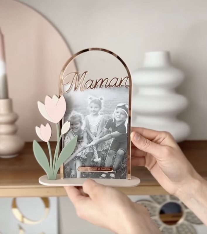 قاب بهصورت ایستاده طراحی شده و از پلکسی شفاف و رنگی ۳ میل ساخته شده است. گلهای تزئینی روی پایه نصب شدهاند و عبارت “Maman” در قسمت بالا قرار دارد. رنگهای استفادهشده ملایم و هماهنگ با فضای احساسی هدیه هستند.