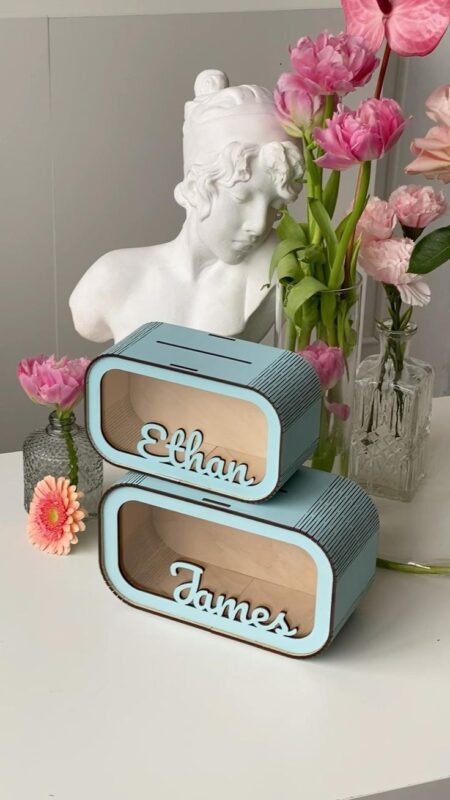 بدنه این محصول از چوب سهلایه با ضخامت ۳ میلیمتر ساخته شده که با رنگآمیزی ظریف و طراحی نرم، هم مقاومه و هم چشمنواز. جلوی قلک یک پنجره شفاف وجود داره که محتویات داخل قلک رو نشون میده و انگیزهی بیشتری برای پسانداز در بچهها ایجاد میکنه. اسم کودک با فونتی فانتزی روی پنجره چسبیده که قلک رو بهصورت اختصاصی شخصیسازی میکنه.
