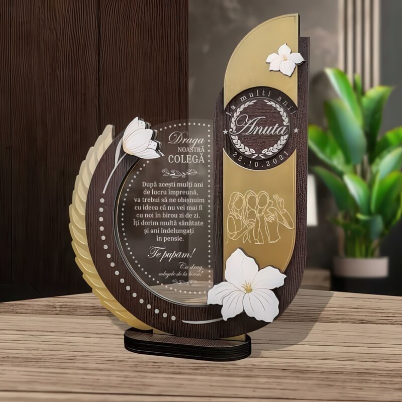 متن تقدیر یا پیام دلخواه روی پلکسی شفاف حکاکی میشود و بخش طلایی مولتیاستایل در کنار امدیاف تیره، تضاد رنگی زیبایی ایجاد میکند. طراحی خلاقانه با خطوط منحنی و گلهای برجسته باعث شده این لوح تقدیر علاوه بر ارزش معنوی، بهعنوان یک المان دکوراتیو نیز قابل استفاده باشد.