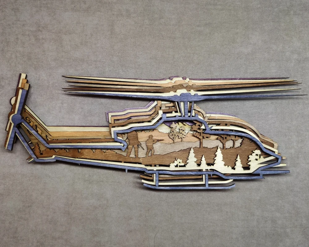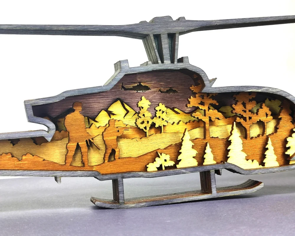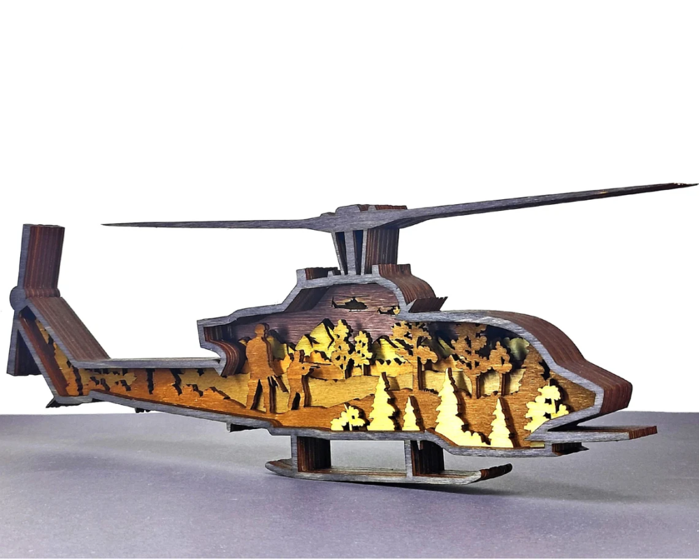 این ماکت چوبی دارای طراحی سهبعدی و لایهای است که با ترکیب چوبهای طبیعی، صحنهای زیبا از جنگل، کوهستان و یک سرباز را در بدنه هلیکوپتر نمایش میدهد. طراحی منحصربهفرد آن، جلوهای خاص و جذاب به هر فضایی میبخشد.