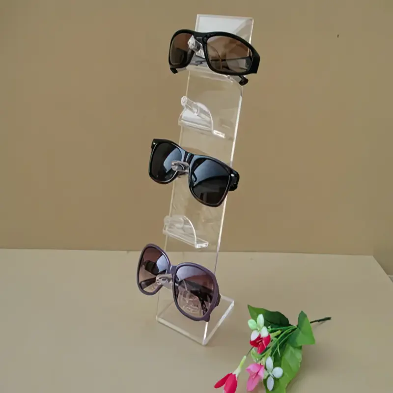 این استند از پلکسی گلاس شفاف با ضخامت ۳ میلیمتر ساخته شده و دارای طراحی عمودی با ۵ نگهدارنده قوسی شکل است. پایه زاویهدار آن تعادل استند را تضمین کرده و امکان چیدمان مرتب عینکها را بهراحتی فراهم میکند.