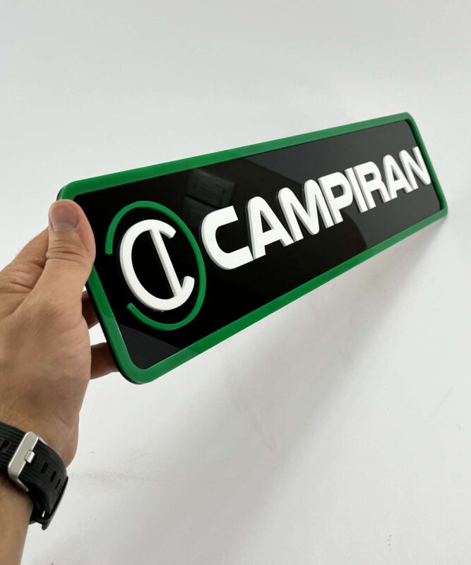 تابلو بهصورت مستطیلی با گوشههای گرد طراحی شده. زمینه مشکی براق، نوشتههای برجسته سفید، لوگوی برجسته و قاب دور سبز رنگ، جلوهای مدرن و رسمی به محصول دادهاند. رنگها با پلکسی مجزا ساخته و لایهلایه روی هم مونتاژ شدهاند.