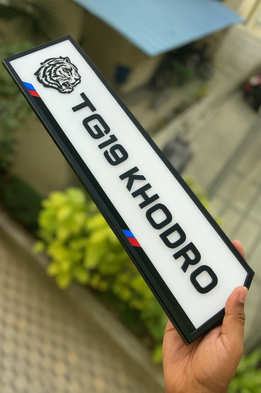 پلاک از متریال پلکسی با کیفیت بالا و ضخامت ۳ میلیمتر ساخته شده. حروف برجستهی مشکی روی زمینه سفید با کنتراست قوی، باعث میشن نوشته TG19 KHODRO از فاصله دور هم کاملاً دیده بشه. لوگوی ببر در گوشهی بالا و نوار رنگی قرمز-آبی پایین، حس سرعت، قدرت و هویت برند رو بهخوبی منتقل میکنن.