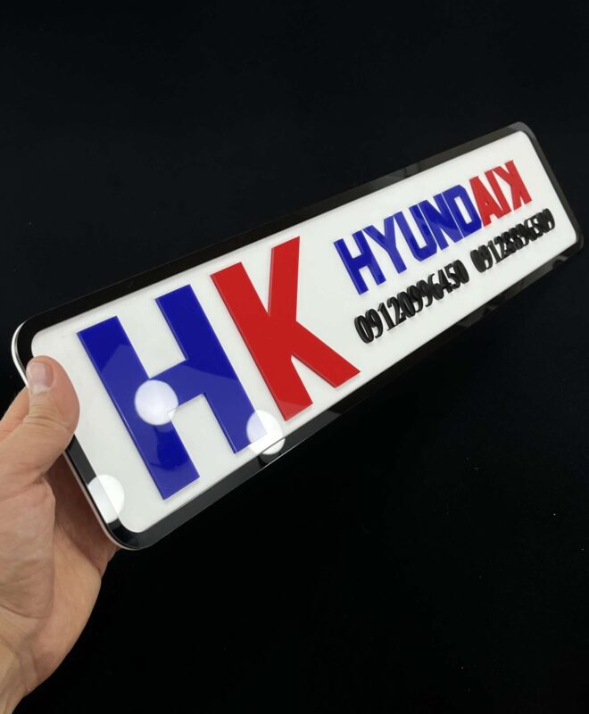 پلاک مستطیلی با ابعاد استاندارد، زمینه سفید براق، حروف برجسته رنگی (قرمز و آبی)، قاب مشکی خمکاریشده و سطح صیقلی که نور رو به خوبی بازتاب میده.