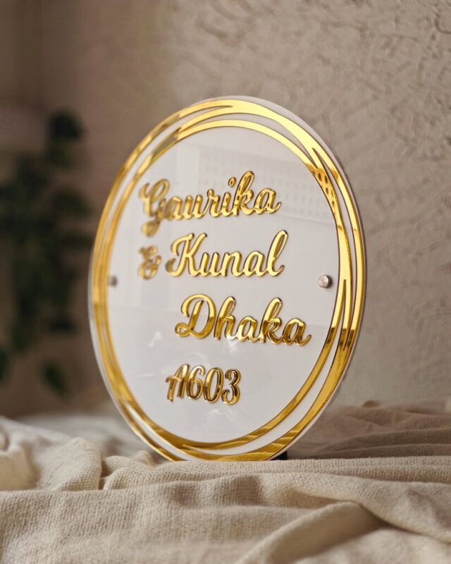 پلاک دکوراتیو ورودی دارای طراحی گرد با حاشیههای آینهای طلایی است. نوشتهها با فونت زیبا و برجسته از پلکسی آینهای طلایی ساخته شدهاند و روی زمینه شفاف قرار گرفتهاند که جلوهای خاص و لوکس به پلاک میبخشد.