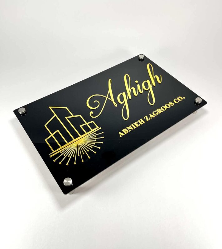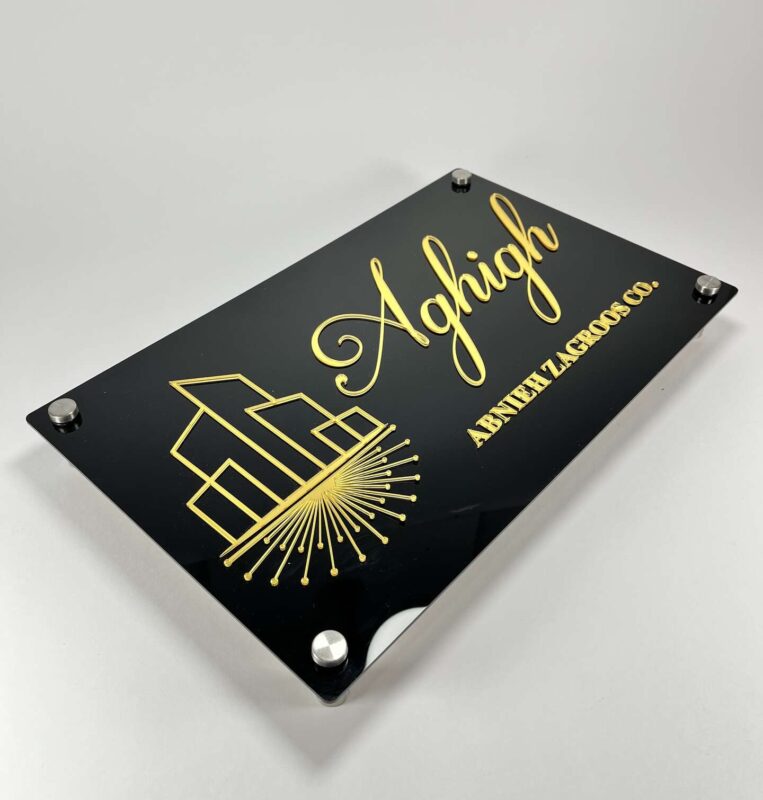 پلاک از پلکسی گلاس مشکی با ضخامت مناسب ساخته شده و لوگو و نوشتهها بهصورت طلایی چاپ شدهاند. با چهار عدد اسپیسر فلزی نصب میشود که ظاهری شناور و حرفهای به آن میدهد.