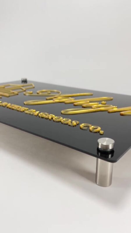 طراحی مینیمال، رنگ مشکی کلاسیک با نوشتههای طلایی و استفاده از اسپیسرهای استیل برای نصب دیواری، این پلاک رو به یک انتخاب حرفهای و لاکچری تبدیل کرده. جلوه سهبعدی لوگو و نوشتهها، در کنار ظرافت چاپ مستقیم روی پلکسی، باعث میشه که هویت بصری برندتون به بهترین شکل ممکن نمایش داده بشه.