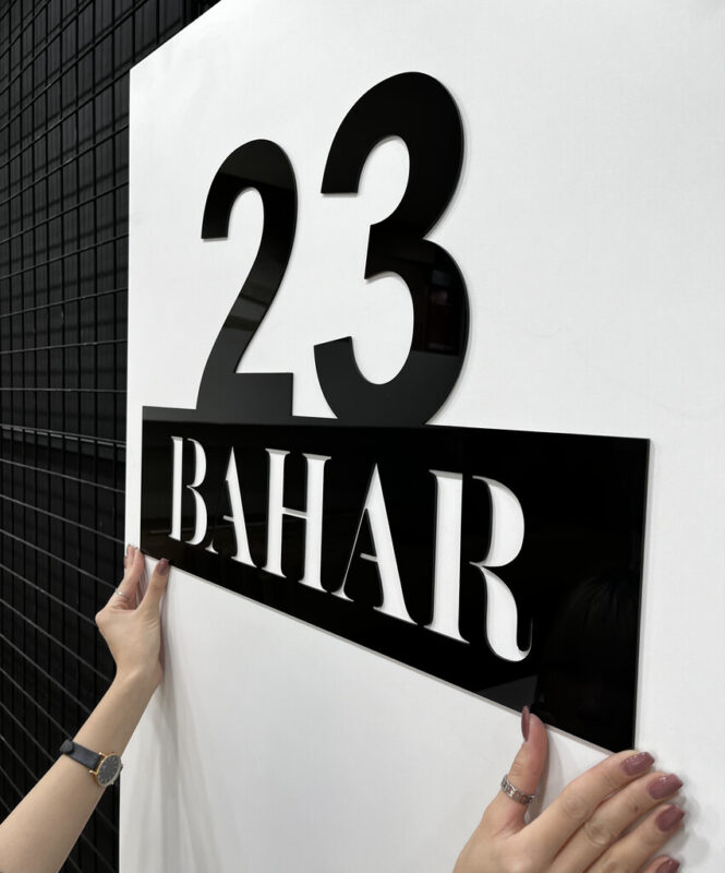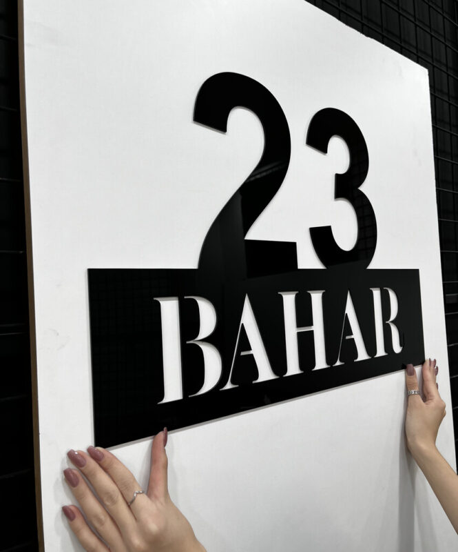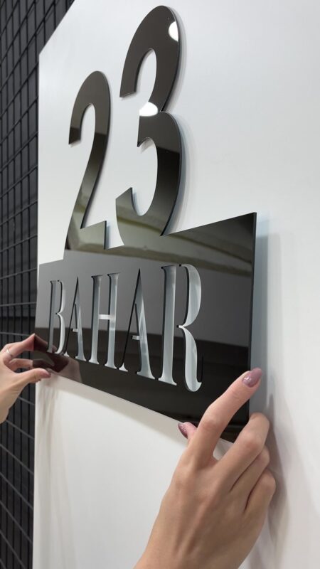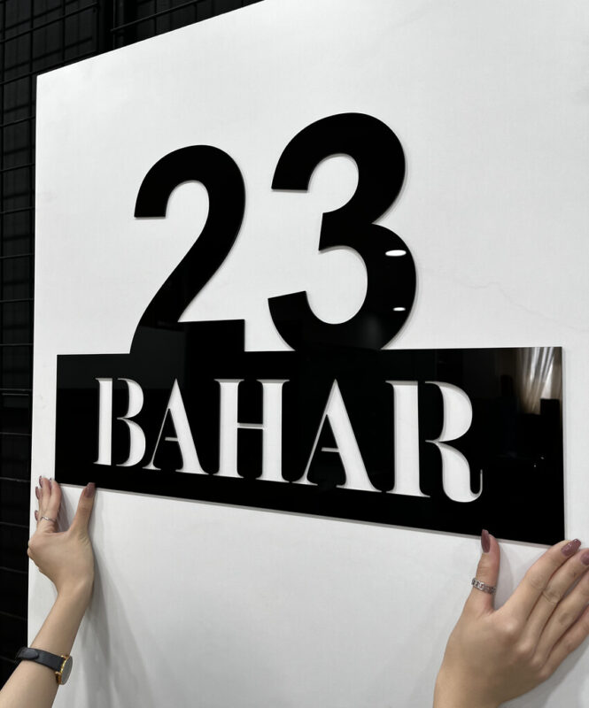 این پلاک از پلکسی براق مشکی ساخته شده و ترکیب عدد و نام بهشکلی زیبا روی دیوار نصب میشه. بخش عددی با فونتی درشت و خوانا طراحی شده و بخش متنی بهصورت حروف برشخورده، جلوهای لوکس و حرفهای به محیط میده. همه چیز با دقت لیزری برش خورده تا ظاهری بینقص و تمیز داشته باشه.