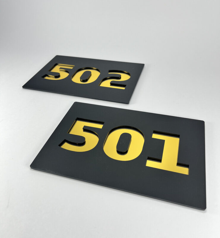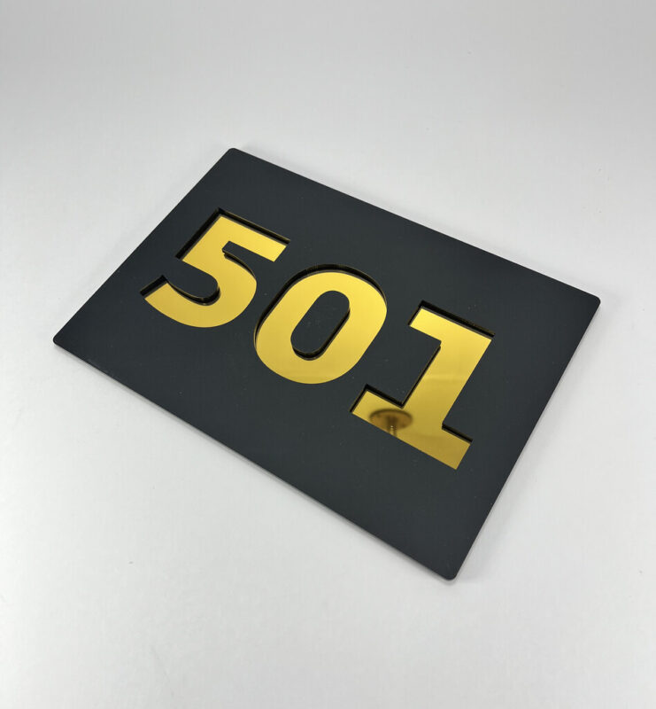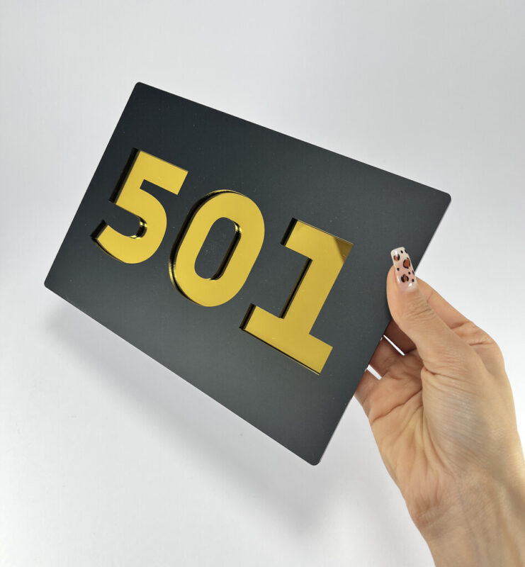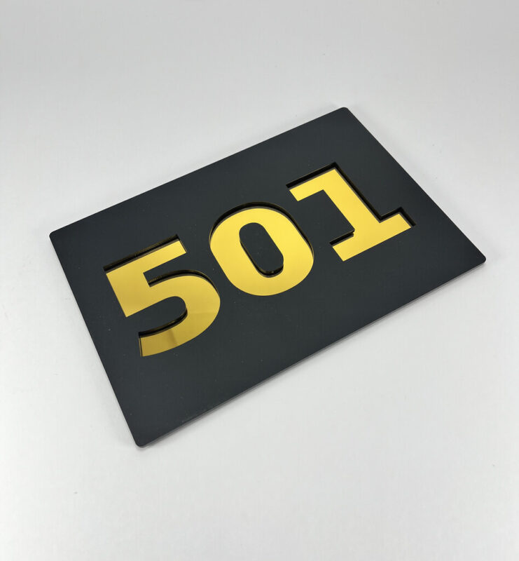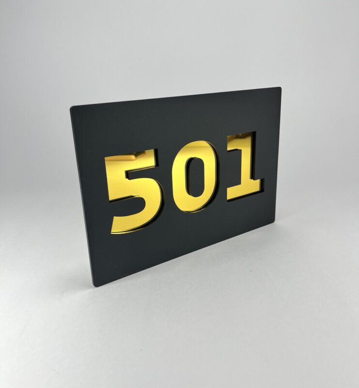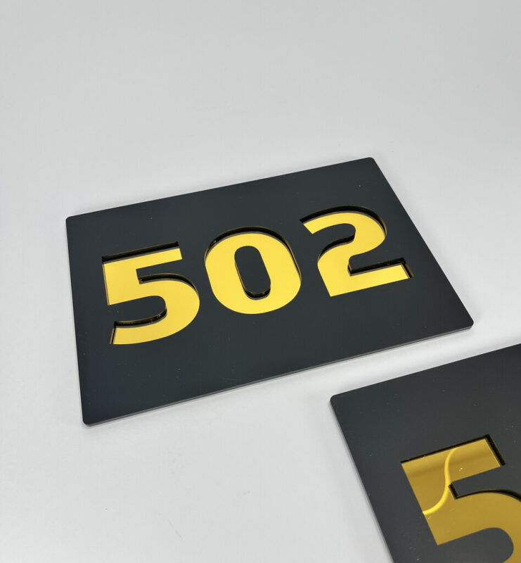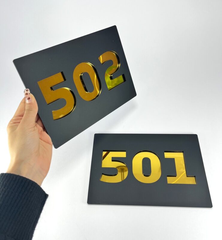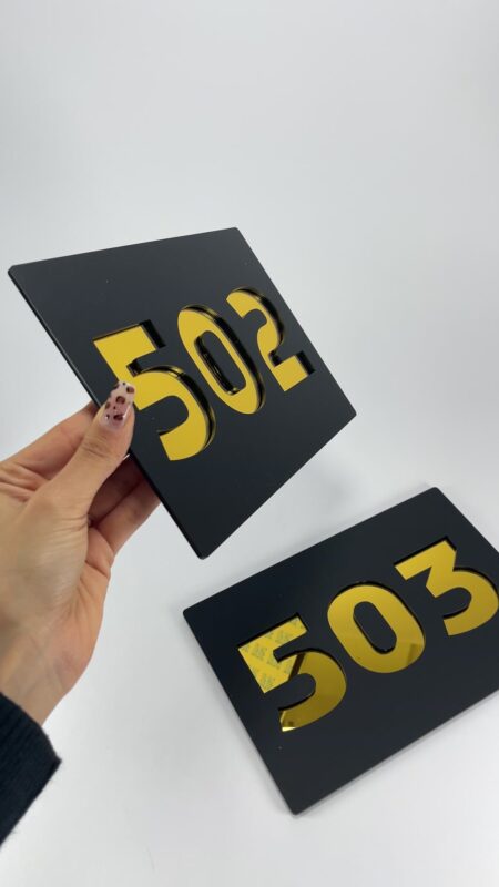 این پلاک از پلکسی با ضخامت ۳ میلیمتر ساخته شده است. ترکیب رنگ مشکی و طلایی جلوهای لوکس به آن بخشیده و برشهای دقیق لیزری باعث شده که اعداد و نوشتهها وضوح بالایی داشته باشند. این محصول دارای طراحی ساده و مینیمال است که خوانایی را در هر شرایطی حفظ میکند.