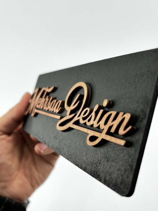 این پلاک در قالب مستطیلی با لبههای نرم طراحی شده. نوشته یا لوگو با متریال چوبی یا پلکسی طلایی، بهصورت برجسته روی زمینه پلکسی نصب شده و کاملاً چشمنواز، خوانا و جذاب است. ترکیب رنگ چوب طبیعی، مشکی و طلایی جلوهای خاص و شیک ایجاد کرده است.