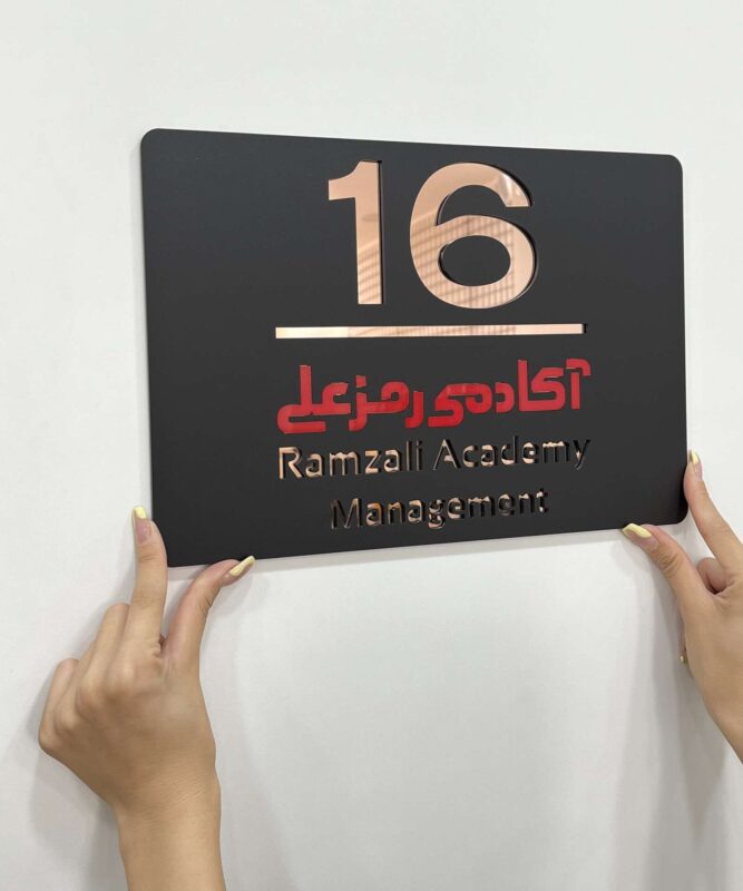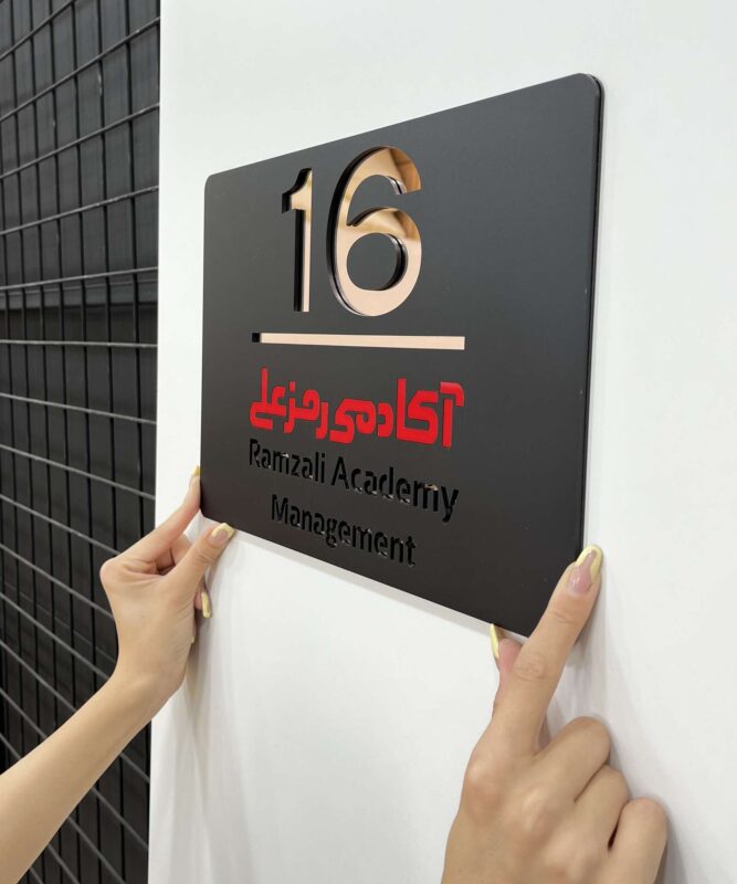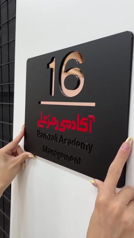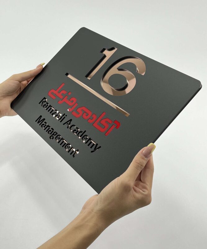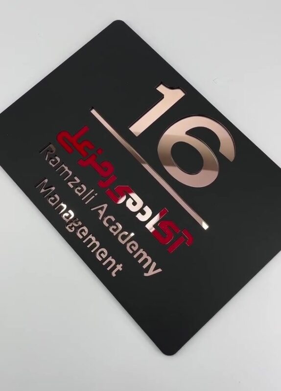 بدنه اصلی این پلاک از پلکسی مشکی مات ساخته شده که نوشتهها و شماره اتاق بهصورت دقیق روی اون برش خورده. در زیر هر بخش، رنگ متفاوتی از پلکسی آینهای (مانند طلایی، نقرهای یا قرمز براق) قرار گرفته که از لابهلای برشها به چشم میاد و جذابیت بصری فوقالعادهای ایجاد میکنه. 😍