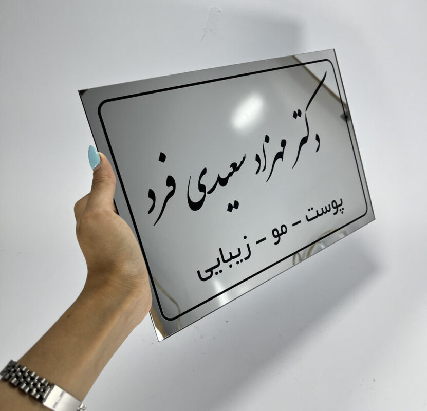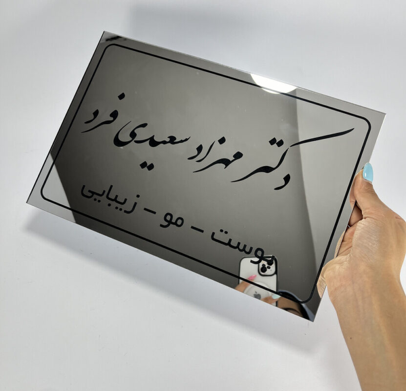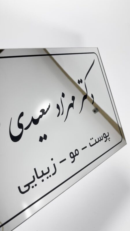 پلاک مطب پلکسی آینهای با ضخامت ۳ میلیمتر و طراحی مستطیلی، دارای جلوهای شفاف و براق است. این پلاک با متن و طراحی سفارشی، ظاهری شیک و مدرن به فضای مطب میبخشد.