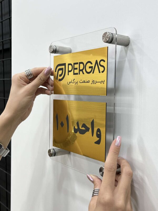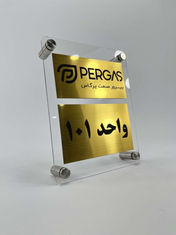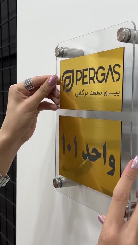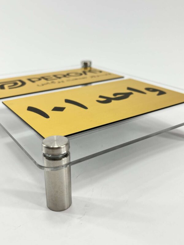 این پلاک از دو لایه تشکیل شده: لایه پشت از جنس پلکسی شفاف با ضخامت مناسب، و لایه رویی مولتیاستایل طلایی که نوشتهها روی اون حکاکی شدن. نصب پلاک با استفاده از ۴ عدد اسپیسر فلزی انجام میشه که به دیوار پیچ میشن و نمایی شناور و شفاف ایجاد میکنن.