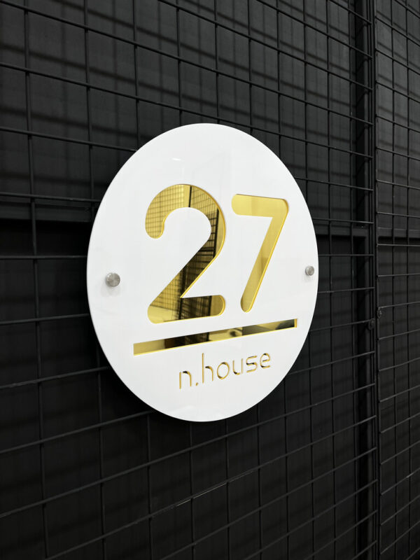 این پلاک از متریال پلکسی ساخته شده که دارای ضخامت ۳ میلیمتری است. رنگ سفید براق در ترکیب با بخشهای طلایی، جلوهای لوکس به محصول بخشیده است. همراه با اسپیسر برای نصب حرفهایتر ارائه میشود.