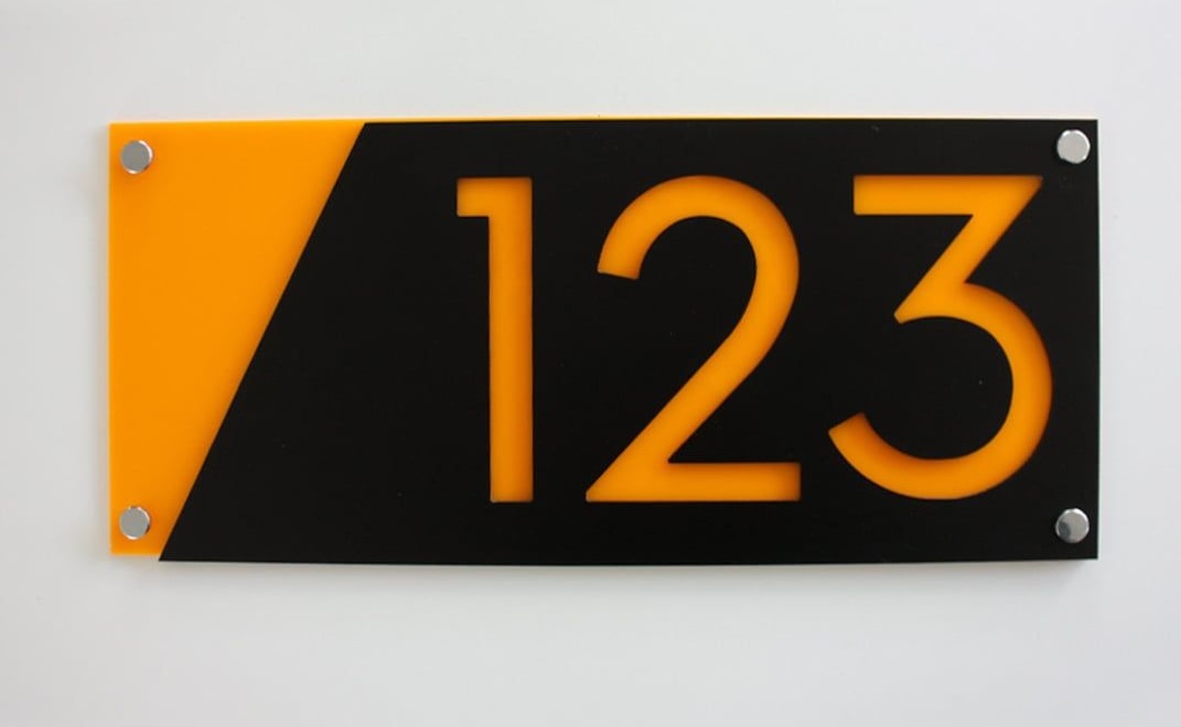 پلاک از دو لایه پلکسی گلاس با رنگهای مشکی و نارنجی تشکیل شده است. اعداد با برش لیزری دقیق از لایه مشکی جدا شده و زمینه نارنجی از زیر نمایان است. چهار عدد اسپیسر فلزی در گوشهها نصب پلاک را آسان و حرفهای کرده است.