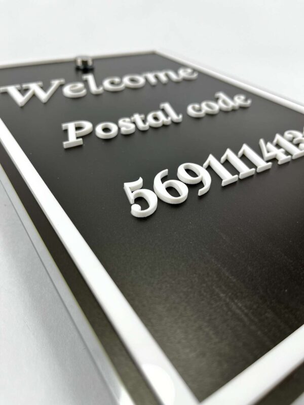 اگه دنبال یه تابلو ورودی شیک و متفاوت برای خونه یا دفتر کارت هستی، این پلاک با طراحی چشمنواز و ترکیب رنگی جذاب دقیقاً همون چیزیه که لازمه 😍 نوشتهی “Welcome” همراه با عبارت “Postal code” و شماره کد پستی، با دقت بسیار بالا از پلکسی سفید برش خورده و روی زمینهی مشکی نصب شده که جلوهای برجسته، شفاف و حرفهای به محصول داده.