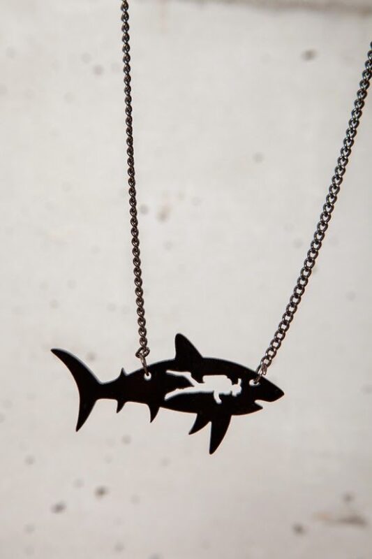 پلاک این گردنآویز بهشکل کوسه طراحی شده و با جزئیات سیلوئت، نمایی از یک غواص رو درون بدنه کوسه نشون میده. متریال پلکسی مشکی با سطح براق، ظاهر مدرن و خاصی به کار داده. زنجیر فلزی مشکی با حلقههای ظریف، سبک و در عین حال مقاوم طراحی شده.
