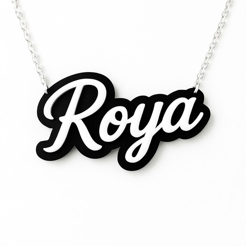 گردنبند از پلکسی مشکی ۳ میلیمتری ساخته شده که نوشته “Roya” بهصورت برجسته و سفید روی اون قرار گرفته. طراحی مدرن و ظریف، همراه با زنجیر فلزی نقرهای، ظاهر شیک و منحصربهفردی به این آویز داده.