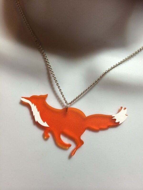 گردنبندی از پلکسی گلس با رنگ نارنجی و سفید، برش لیزری دقیق، سبک و مقاوم با طراحی طرح روباه.