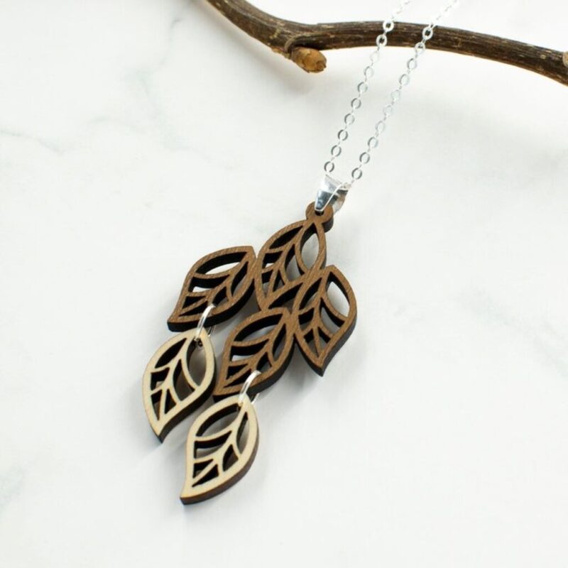 این گردنبند از چند برگ چوبی ظریف تشکیل شده که با طراحی مینیمال و طبیعی روی هم قرار گرفتهاند و توسط حلقههای فلزی کوچک به هم متصل شدهاند.