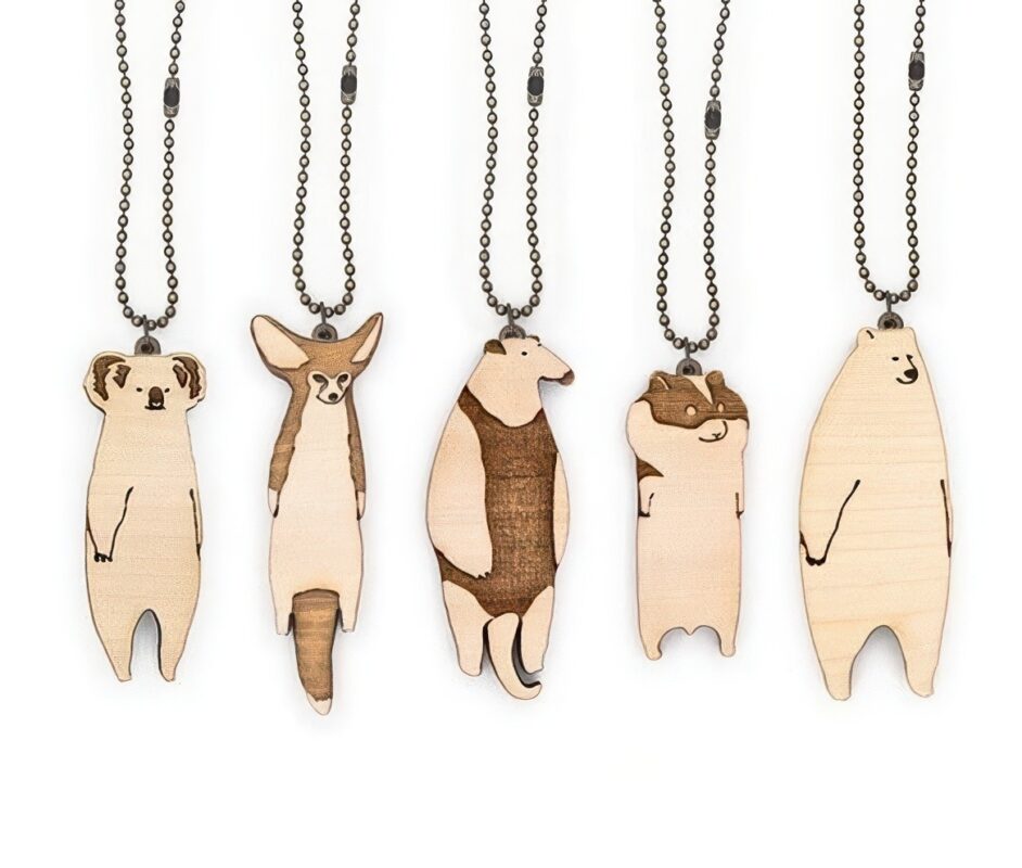 گردنبند چوبی طرح حیوانات مدل TH_31102 بهواسطه متریال چوب سهلایه ۳ میلیمتری و طراحی فانتزی، تجربهای از دنیای طبیعت و هنر دستساز را به شما هدیه میدهد🐨🦊🐻🦝🐻❄️. هر آویز با الگوبرداری از نه شکل متفاوت (کوآلا، فِنتک فاکس، خرس، راکون و خرس قطبی و…) برش لیزری شده و جزئیات حکاکیشده روی چوب، حس ارگانیک و گرم چوب طبیعی را منتقل میکند. ترکیب لایههای مختلف چوب در ضخامت استاندارد، عمق و بافتی جذاب به طرح بخشیده که در هر زاویهدید، جلوهای متفاوت و دلنشین بهنمایش میگذارد.