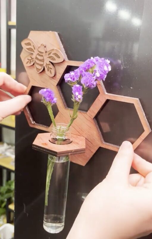 ساختهشده از چوب سهلایه با طراحی لانهزنبوری و حکاکی زنبور. دارای یک لولهی شیشهای شفاف و مجهز به مگنت قدرتمند برای اتصال به سطوح فلزی مثل یخچال.