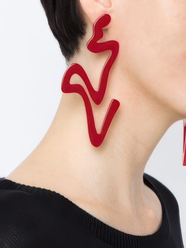 طرح کلی گوشواره به شکل یک فرم آزاد و منحنی طراحی شده که شبیه رد قلم یا خط سیال هنریه. رنگ قرمز براق و فرم نامتقارن، جلوهای مجسمهگونه و مدرن به این گوشواره داده. ابعاد نسبتاً بزرگ و وزن بسیار سبک باعث میشه کاملاً راحت و در عین حال تأثیرگذار باشه.