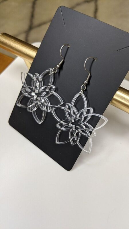 این گوشوارهها از پلکسی شفاف ساخته شدهاند و به شکل گل چندلایه طراحی شدهاند. قلاب فلزی نقرهای ضد حساسیت و طراحی ظریف و شیک از ویژگیهای ظاهری این محصول است.