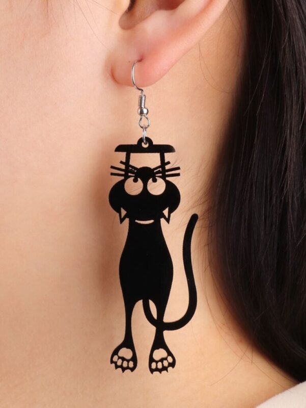یک جفت گوشواره از جنس پلکسی مشکی براق، طراحی فانتزی گربه با برش لیزری دقیق، قلاب فلزی ضد حساسیت نقرهای رنگ و وزن بسیار سبک.