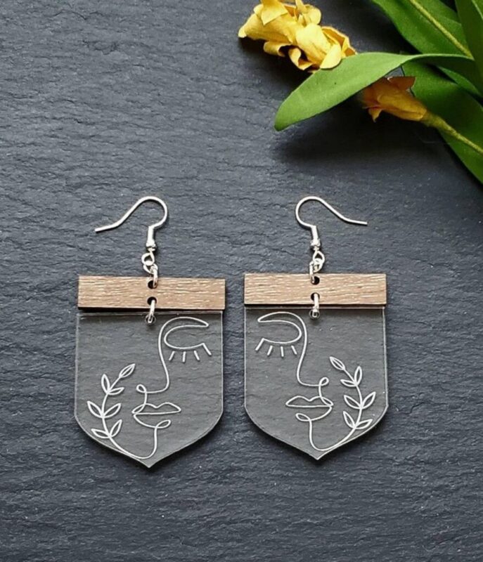 گوشوارهای با پایه چوبی سه لایه و بدنه پلکسی شفاف با حکاکی طرح خطی صورت، سبک و زیبا با ابعاد مناسب برای استفاده راحت.
