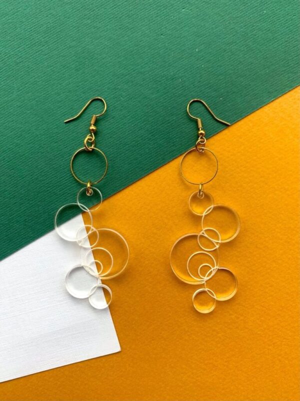 این گوشواره از پلکسی شفاف با ضخامت ۳ میلیمتر ساخته شده و شامل مجموعهای از دایرههای توخالی و تو در تو در ابعاد مختلفه که بهصورت آویزان به هم متصل شدن. قلابها به رنگ طلایی کلاسیک و ضد حساسیت انتخاب شدن تا هم زیبا باشن و هم راحت استفاده بشن.