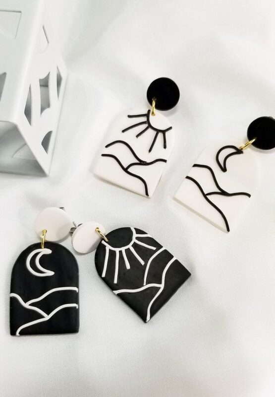 طرح کلی گوشواره به شکل قوسیمانند (شبیه طاق) طراحی شده که داخل آن با خطوط ساده، نمادهایی از خورشید، ماه، کوه و طبیعت ایجاد شده است. رنگهای سفید و مشکی در تضادی جذاب و خنثی قرار گرفتن و ظاهر گوشوارهها رو برای انواع استایلها مناسب کردهاند.