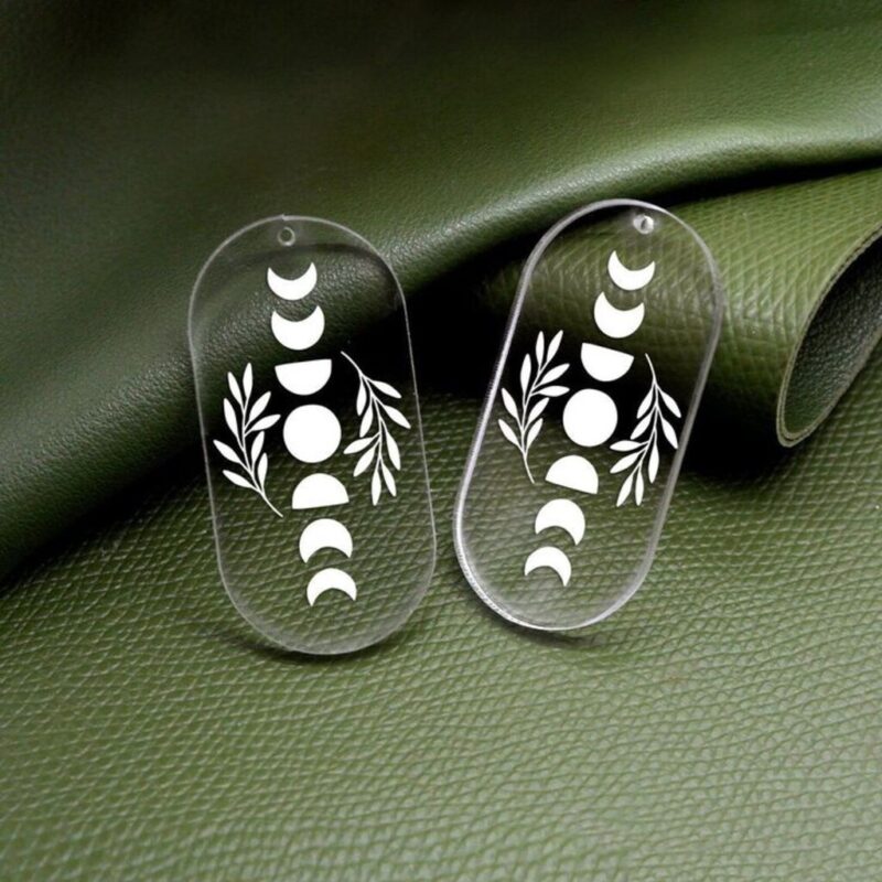 پلکسی شفاف حکاکی شده با طرح ماههای قمری و شاخههای برگ، طراحی بیضی کشیده با سوراخ کوچک در بالا برای اتصال قلاب گوشواره.