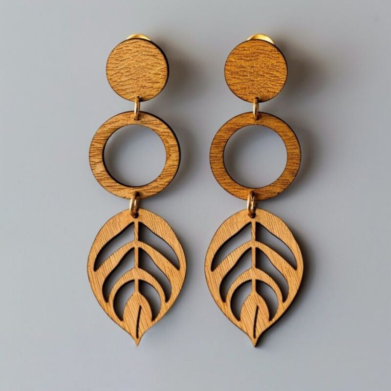 ترکیبی از فرم دایره و برگ، ساختهشده از چوب طبیعی با رنگ گرم، سطح پرداختشده و برشهای دقیق لیزری. سبک طراحی برگ بهصورت گرافیکی و ظریف اجرا شده و ظاهر گوشواره را مدرن، هنری و جذاب کرده است.