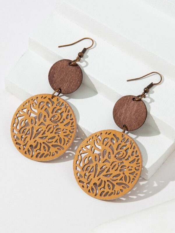 این گوشواره از دو قطعه چوب سهلایه ساخته شده که یکی ساده و دیگری با طرح دایرهای مشبک است و توسط یک حلقه فلزی به هم متصل شدهاند. قلاب فلزی ضد حساسیت نیز به راحتی روی گوش قرار میگیرد.