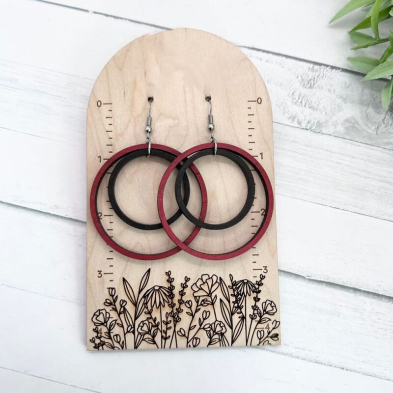 این گوشواره از چوب سهلایه با ضخامت ۳ میلیمتر ساخته شده و طراحی اون به صورت دو حلقهی هممرکز با ترکیب رنگی مشکی و قرمز، حس مدرن و متفاوتی رو منتقل میکنه. برشهای دقیق با لیزر باعث شده ظاهر این گوشواره کاملاً منظم و چشمنواز باشه، در حالی که وزن کمش باعث میشه استفادهی طولانیمدت اصلاً اذیتکننده نباشه.