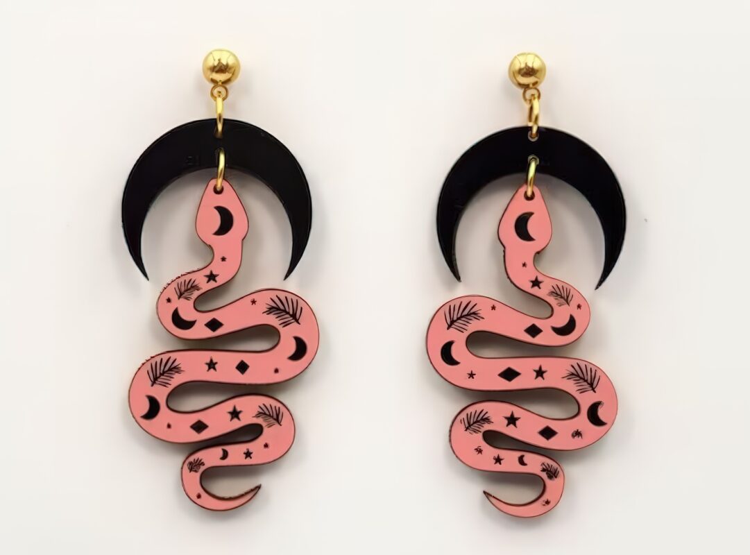 شامل یک جفت گوشواره چوبی با ضخامت ۳ میلیمتر، با طراحی مار چاپشده بر زمینه صورتی و نمادهای ماه و ستاره. ترکیب با هلال ماه مشکی در قسمت بالایی و قلاب طلایی رنگ، ظاهری خاص و متفاوت ایجاد کرده.